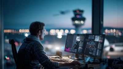ein männlicher Fluglotse vor Bildschirmen eines Digital Towers